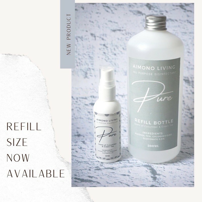 Cairan Disinfectant ukuran 500ml botol refill untuk Pure.Terbuat dari cairan antiseptik Komposisi: Alkohol 70%, Chlorhexidine, Gluconate 0,5% izin kemenkes :RI PKD 20501021135Scent of Cucumber & Green TeaAll Purpose Disinfectant yang bisa di gunakan sebagai hand sanitizer
