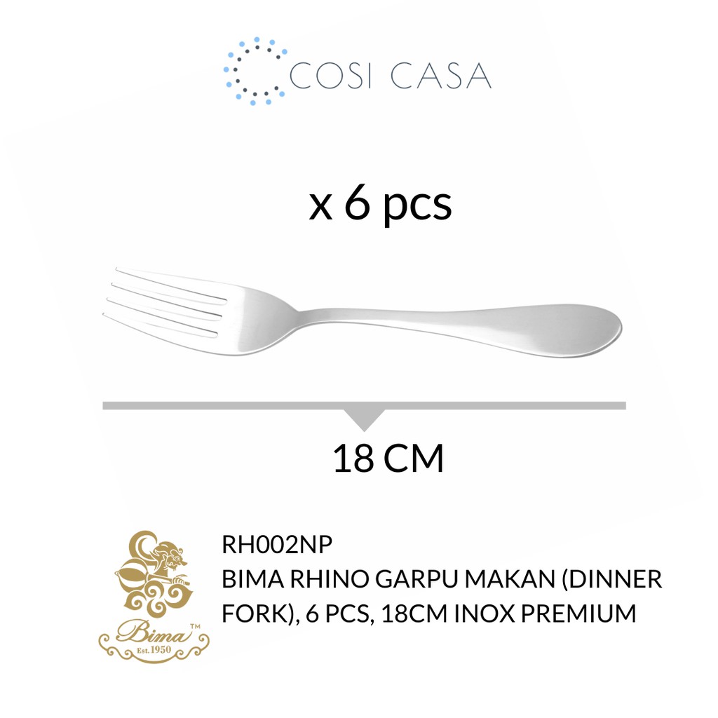 BIMA RHINO GARPU MAKAN (DINNER FORK), 6 PCS, INOX PREMIUM, RH002NP. Panjang 18 cm. Bima Rhino yang terbuat dari material Stainless Steel berkualitas tinggi untuk memastikan kesehatan alat makan anda.Berdiri sejak tahun 1950, Bima dikenal keunggulannya sebagai pionir produsen peralatan dapur berkualitas prima yang bertaraf international. Pada tahun 1970, Bima menjadi pabrik panci Stainless Steel pertama di Indonesia dan terus berinovasi untuk meningkatkan kualitas dan teknologi. Produk Stainless Steel Bima merupakan produk andalan yang banyak diexport ke berbagai belahan dunia seperti USA, Japan, Europe, South Korea, South Africa, dll. Berpengalaman selama lebih dari 69tahun, dan didukung oleh inovasi teknologi modern, Bima adalah sebuah produk kebanggaan Tanah Air yang menjadi warisan bagi generasi penerus.Temukan barang dapur dan ruang makan berkualitas di toko kami, Cosicasa Livi